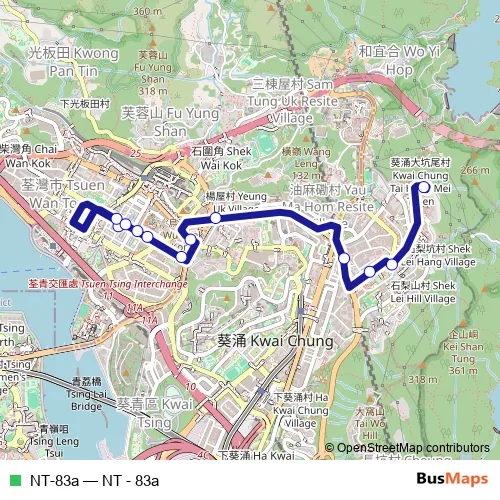 See why over 2 million users trust and consider busmaps.com as the best public transport website. busmaps gives you Tsuen Wan Buses suggested routes, real-time bus tracker, line route maps in Tsuen Wan, and helps to find the closest NT-83a bus stops near you. No internet available? Download an offline PDF map and bus schedule for the NT-83a bus to take on your trip.