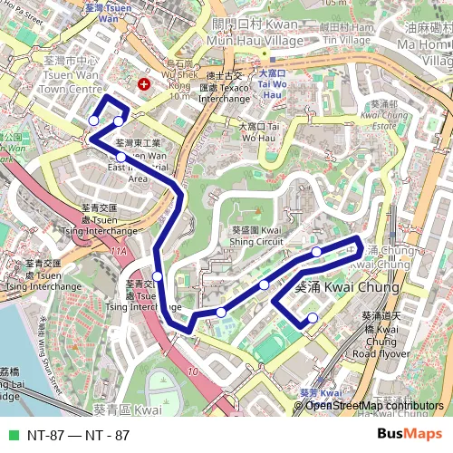 The first stop of the NT-87 bus route is Shing Fong Street, near Hip Tak Building and the last stop is HAM TIN Street, near Shek Pik Resettlers' Playground, Tsuen Wan. NT-87 (NT - 87) is operational during everyday.