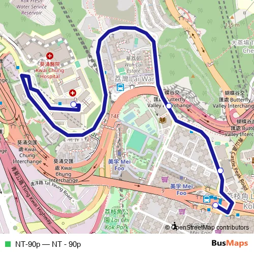 The first stop of the NT-90p bus route is Princess Margaret Hospital Road, near Princess Margaret Hospital Block G and the last stop is MEI LAI Road, near Mei Foo Bus Terminus. NT-90p (NT - 90p) is operational during everyday.