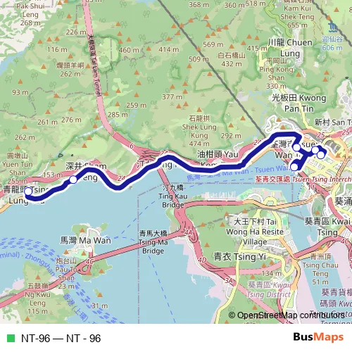 The first stop of the NT-96 bus route is Tsing Lung Tau (Lung Yue Road) and the last stop is Tsuen Wan (Hoi Pa Street). NT-96 (NT - 96) is operational during on weekdays.