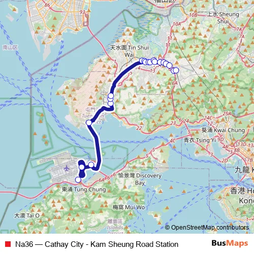 The first stop of the Na36 bus route is Cathay Pacific City, Chun Ming Road and the last stop is Kam Sheung Road Station. Na36 (Cathay City - Kam Sheung Road Station) is operational during everyday.