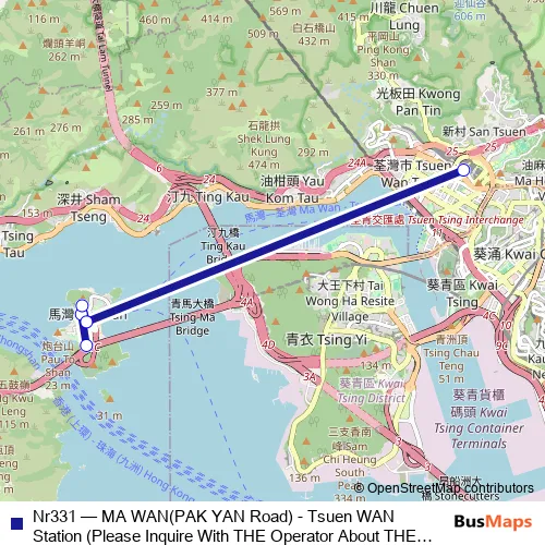Click here to view the nearest Nr331 - MA WAN(PAK YAN Road) - Tsuen WAN Station (Please Inquire With THE Operator About THE Payment Arrangement OF THE TWO-WAY Fare ON This Route.) bus stop.