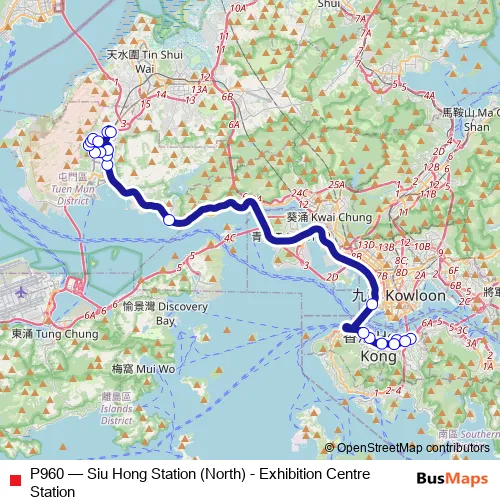The first stop of the P960 bus route is Exhibition Centre Station Bus Terminus and the last stop is Siu Hong Station. P960 (Siu Hong Station (North) - Exhibition Centre Station) is operational during on weekdays.