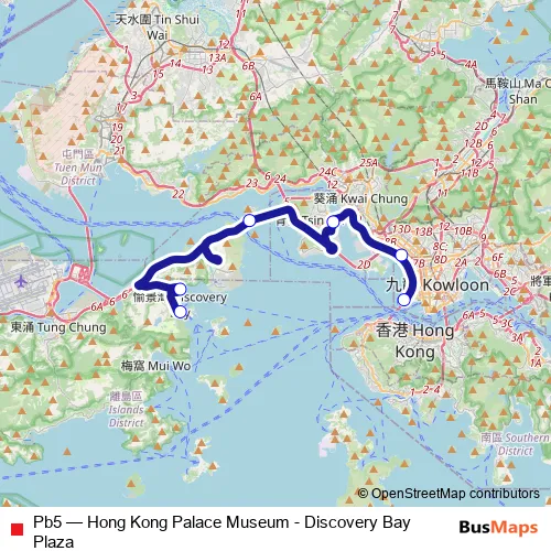 The first stop of the Pb5 bus route is Hong Kong Palace Museum and the last stop is Discovery Bay Plaza. Pb5 (Hong Kong Palace Museum - Discovery Bay Plaza) is operational during everyday.