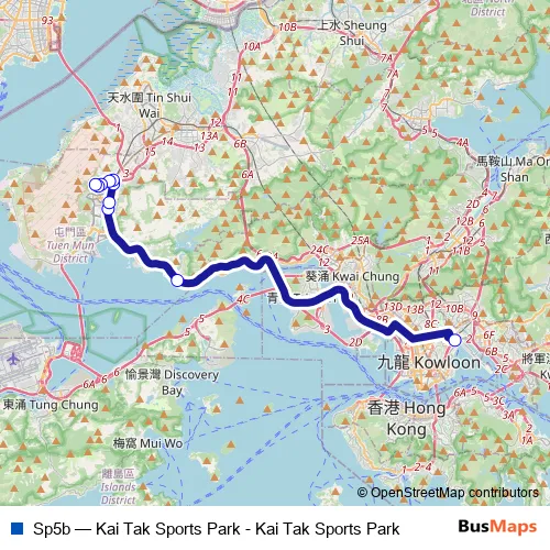 The first stop of the Sp5b bus route is Kai Tak Sports Park, Sung Wong Toi Road and the last stop is Wo Tin Estate. Sp5b (Kai Tak Sports Park - Kai Tak Sports Park) is operational during everyday.