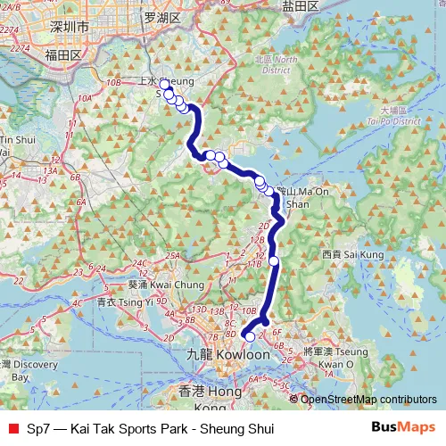 The first stop of the Sp7 bus route is Kai Tak Sports Park and the last stop is Sheung Shui BBI - Sheung Shui Terminus. Sp7 (Kai Tak Sports Park - Sheung Shui) is operational during everyday.