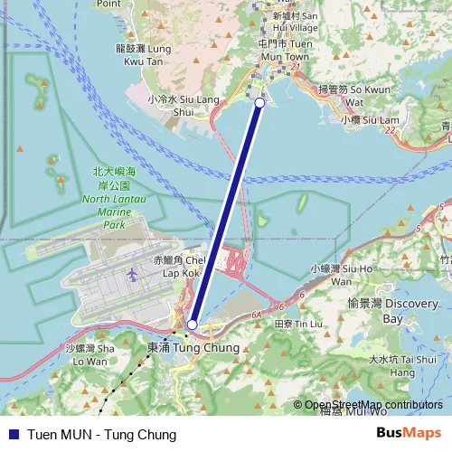 See why over 2 million users trust and consider busmaps.com as the best public transport website. busmaps gives you Tuen Mun Ferries suggested routes, real-time bus tracker, line route maps in Tuen Mun, and helps to find the closest Tuen MUN - Tung Chung ferry stops near you. No internet available? Download an offline PDF map and bus schedule for the Tuen MUN - Tung Chung ferry to take on your trip.