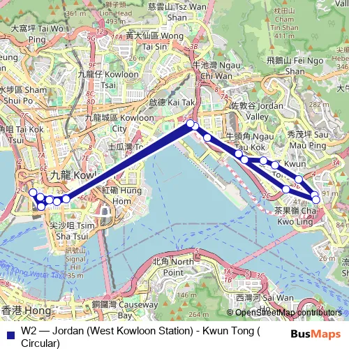 The first stop of the W2 bus route is [Ctb] HSR West Kowloon Station|[Kmb] Jordan (West Kowloon Station) BUS Terminus and the last stop is [Ctb] HSR West Kowloon Station|[Kmb] Jordan (West Kowloon Station) BUS Terminus. W2 (Jordan (West Kowloon Station) - Kwun Tong (Circular)) is operational during everyday.