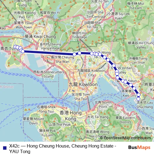 The first stop of the X42c bus route is [Kmb] Hong Cheung House Cheung Hong Estate and the last stop is [Ctb] YAU Tong|[Kmb] YAU Tong BUS Terminus. X42c (Hong Cheung House, Cheung Hong Estate - YAU Tong) is operational during on weekdays.