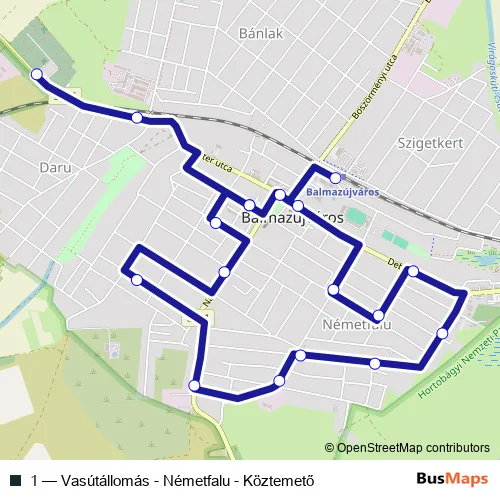 The first stop of the 1 bus route is Balmazújváros, vasútállomás and the last stop is Balmazújváros, Egészségház. 1 (Vasútállomás - Németfalu - Köztemető) is operational during on weekdays.