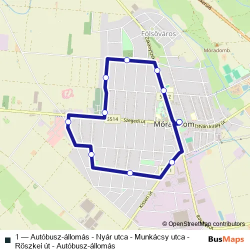 The first stop of the 1 bus route is Mórahalom, autóbusz-állomás and the last stop is Mórahalom, autóbusz-állomás. 1 (Autóbusz-állomás - Nyár utca - Munkácsy utca - Röszkei út - Autóbusz-állomás) is operational during on weekdays.