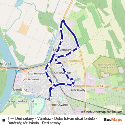 The first stop of the 1 bus route is Baja, Déri sétány and the last stop is Baja, Déri sétány. 1 (Déri sétány - Vámház - Dobó István utcai forduló - Barátság téri iskola - Déri sétány) is operational during on weekends.