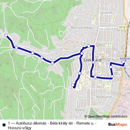 The first stop of the 1 bus route is Szekszárd, autóbusz-állomás (helyi) and the last stop is Szekszárd, Hosszú-völgy. 1 (Autóbusz-állomás - Béla király tér - Remete u. - Hosszú-völgy) is operational during everyday.