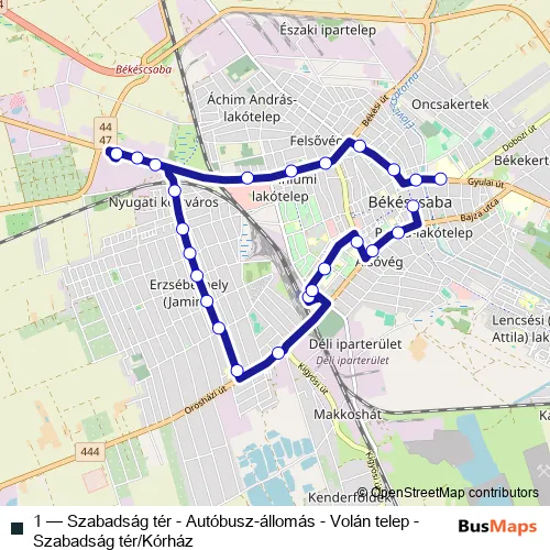 The first stop of the 1 bus route is Békéscsaba, Kórház and the last stop is Békéscsaba, Szabadság tér. 1 (Szabadság tér - Autóbusz-állomás - Volán telep - Szabadság tér/Kórház) is operational during on weekdays.