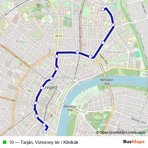 The first stop of the 10 trolleybus route is Tarján, Víztorony tér and the last stop is Klinikák. 10 (Tarján, Víztorony tér / Klinikák) is operational during everyday.