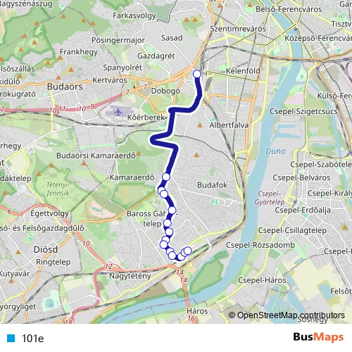 The first stop of the 101e bus route is Kelenföld vasútállomás M and the last stop is Budatétény vasútállomás (Campona). 101e is operational during everyday.