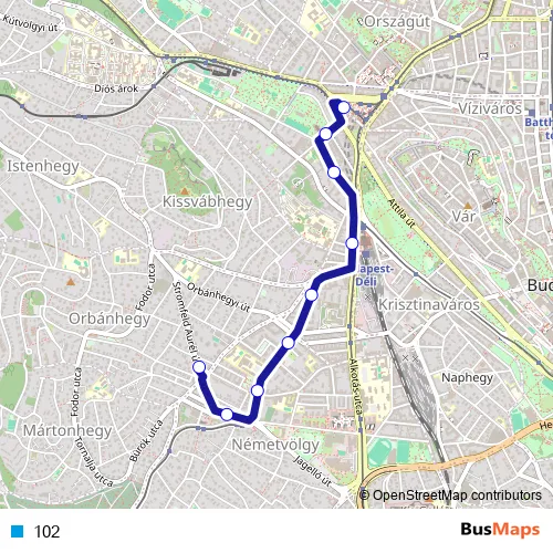 The first stop of the 102 bus route is Széll Kálmán tér M and the last stop is Németvölgyi út. 102 is operational during everyday.