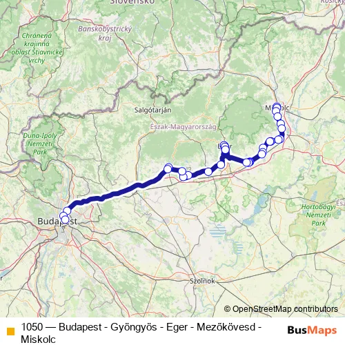 The first stop of the 1050 bus route is Miskolc, autóbusz-állomás and the last stop is Budapest, Stadion autóbusz-pályaudvar. 1050 (Budapest - Gyöngyös - Eger - Mezőkövesd - Miskolc) is operational during everyday.