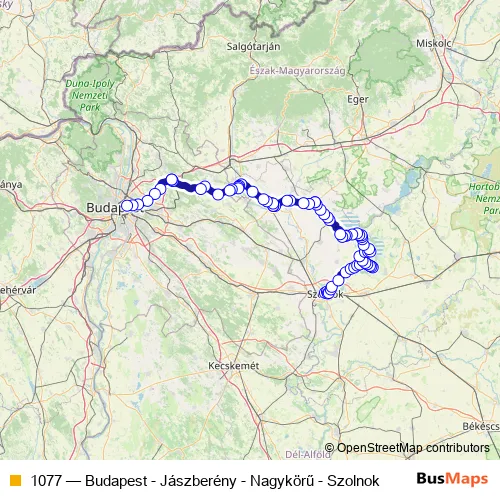 The first stop of the 1077 bus route is Szolnok, autóbusz-állomás and the last stop is Budapest, Stadion autóbusz-pályaudvar. 1077 (Budapest - Jászberény - Nagykörű - Szolnok) is operational during everyday.