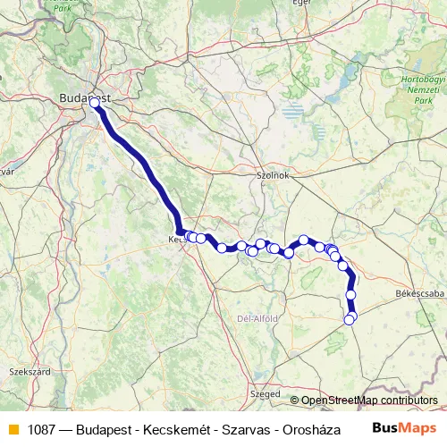 The first stop of the 1087 bus route is Budapest, Népliget autóbusz-pályaudvar and the last stop is Orosháza, autóbusz-állomás. 1087 (Budapest - Kecskemét - Szarvas - Orosháza) is operational during everyday.