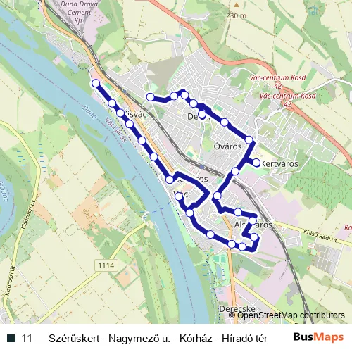 The first stop of the 11 bus route is Vác, Szérűskert autóbusz-forduló and the last stop is Vác, Híradó tér. 11 (Szérűskert - Nagymező u. - Kórház - Híradó tér) is operational during on weekdays.