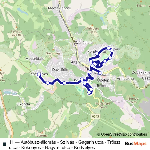 Bus 11 - Autóbusz-állomás - Szilvás - Gagarin utca - Tröszt utca - Kökönyös - Nagyrét utca - Körtvélyes Schedule in Komlo