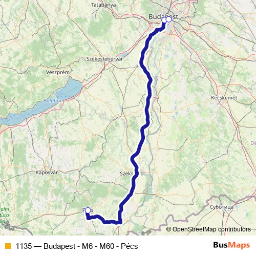 The first stop of the 1135 bus route is Pécs, autóbusz-állomás and the last stop is Budapest, Népliget autóbusz-pályaudvar. 1135 (Budapest - M6 - M60 - Pécs) is operational during everyday.