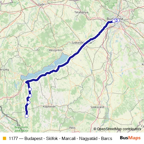 The first stop of the 1177 bus route is Barcs, vasútállomás and the last stop is Budapest, Népliget autóbusz-pályaudvar. 1177 (Budapest - Siófok - Marcali - Nagyatád - Barcs) is operational during everyday.