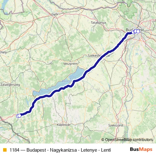 The first stop of the 1184 bus route is Nagykanizsa, autóbusz-állomás and the last stop is Budapest, Népliget autóbusz-pályaudvar. 1184 (Budapest - Nagykanizsa - Letenye - Lenti) is operational during everyday.