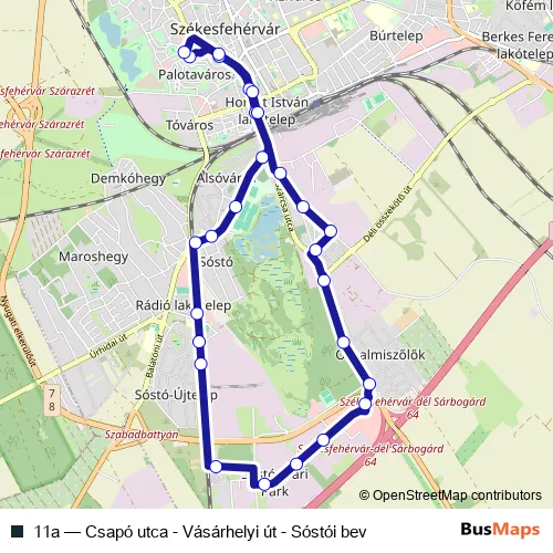 The first stop of the 11a bus route is Székesfehérvár, Csapó utca and the last stop is Székesfehérvár, Vásárhelyi úti lakótelep. 11a (Csapó utca - Vásárhelyi út - Sóstói bev) is operational during everyday.