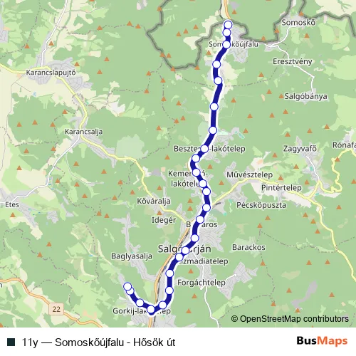 The first stop of the 11y bus route is Somoskőújfalu, országhatár and the last stop is Salgótarján, Hősök úti forduló. 11y (Somoskőújfalu - Hősök út) is operational during on weekdays.