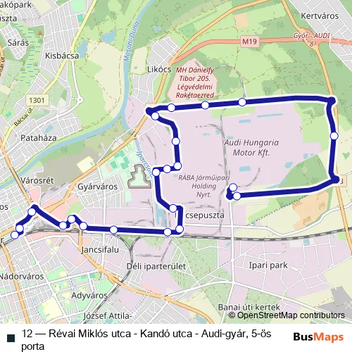 The first stop of the 12 bus route is Győr, Audi-gyár, 5-ös porta and the last stop is Győr, Révai Miklós utca. 12 (Révai Miklós utca - Kandó utca - Audi-gyár, 5-ös porta) is operational during everyday.