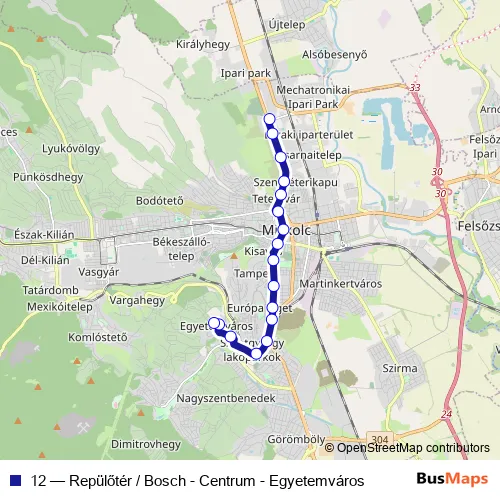 Bus 12 - Repülőtér / Bosch - Centrum - Egyetemváros in Miskolc: Stops & Timetable