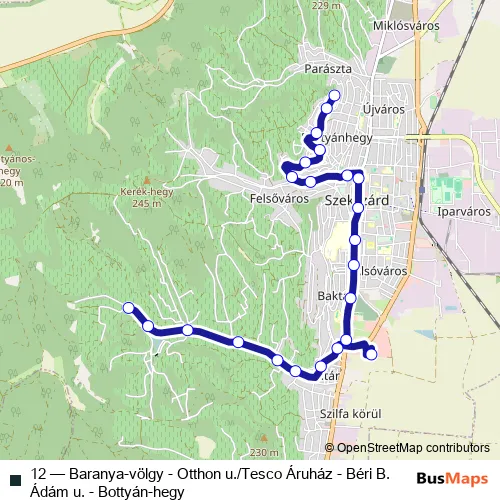 Bus 12 - Baranya-völgy - Otthon u./Tesco Áruház - Béri B. Ádám u. - Bottyán-hegy in Szekszard: Stops & Timetable