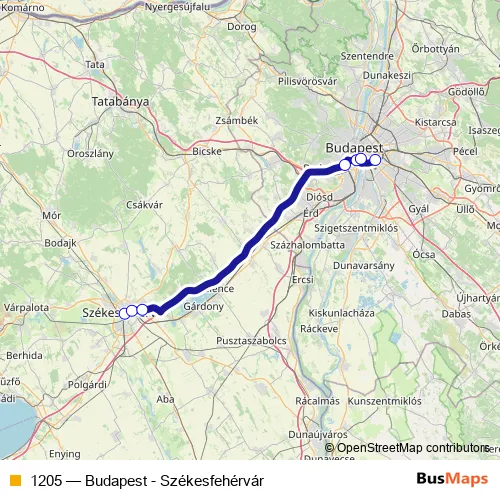 The first stop of the 1205 bus route is Székesfehérvár, autóbusz-állomás and the last stop is Budapest, Népliget autóbusz-pályaudvar. 1205 (Budapest - Székesfehérvár) is operational during everyday.