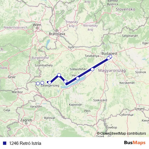 The first stop of the 1246 Retró Istria rail route is Budapest-Keleti and the last stop is Őriszentpéter. 1246 Retró Istria (1246 Retró Istria) is operational during everyday.