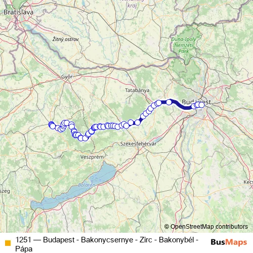 The first stop of the 1251 bus route is Pápa, autóbusz-állomás and the last stop is Budapest, Népliget autóbusz-pályaudvar. 1251 (Budapest - Bakonycsernye - Zirc - Bakonybél - Pápa) is operational during everyday.