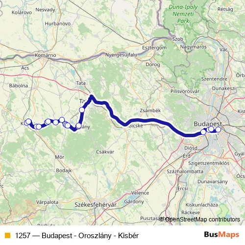 The first stop of the 1257 bus route is Kisbér, autóbusz-állomás and the last stop is Budapest, Népliget autóbusz-pályaudvar. 1257 (Budapest - Oroszlány - Kisbér) is operational during everyday.