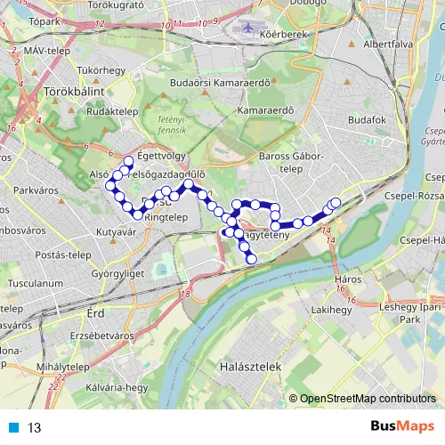 The first stop of the 13 bus route is Diósd, Búzavirág utca and the last stop is Budatétény vasútállomás (Campona). 13 is operational during everyday.