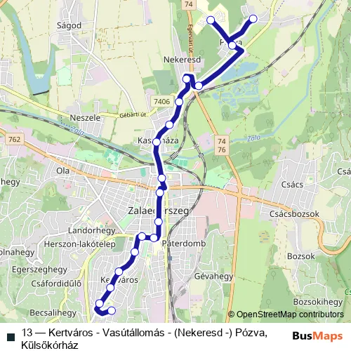 Bus 13 - Kertváros - Vasútállomás - (Nekeresd -) Pózva, Külsőkórház in Zalaegerszeg: Stops & Timetable