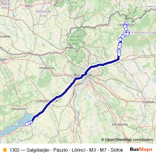 The first stop of the 1302 bus route is Salgótarján, autóbusz-állomás and the last stop is Siófok, autóbusz-állomás. 1302 (Salgótarján - Pásztó - Lőrinci - M3 - M7 - Siófok) is operational during on weekends.