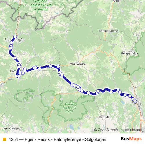 The first stop of the 1354 bus route is Salgótarján, autóbusz-állomás and the last stop is Eger, autóbusz-állomás. 1354 (Eger - Recsk - Bátonyterenye - Salgótarján) is operational during everyday.