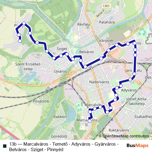 The first stop of the 13b bus route is Győr (Pinnyéd), Új sor and the last stop is Győr, Marcalváros, Kovács Margit utca. 13b (Marcalváros - Temető - Adyváros - Gyárváros - Belváros - Sziget - Pinnyéd) is operational during everyday.