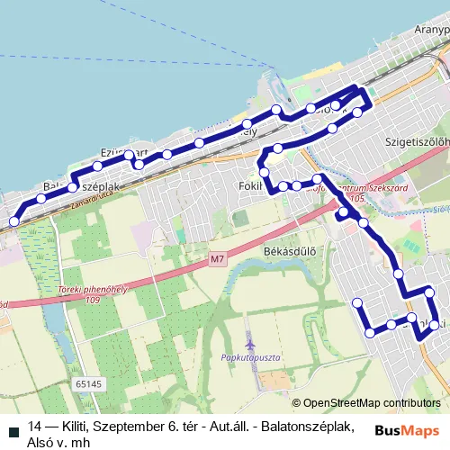 The first stop of the 14 bus route is Siófok (Kiliti), Szeptember 6. tér and the last stop is Siófok (Balatonszéplak), Alsó vasúti megállóhely. 14 (Kiliti, Szeptember 6. tér - Aut.áll. - Balatonszéplak, Alsó v. mh) is operational during on weekends.