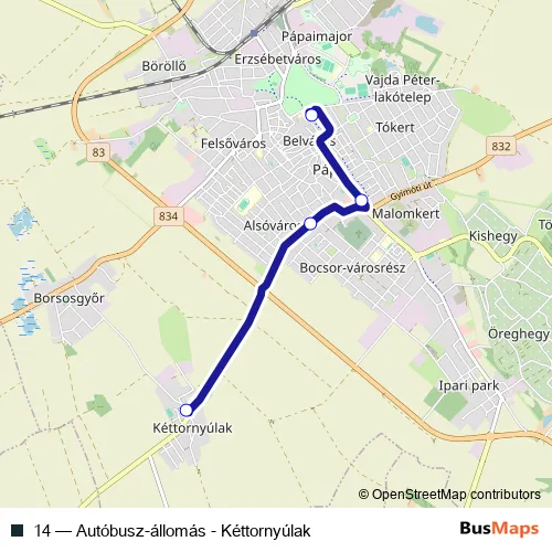 The first stop of the 14 bus route is Pápa, autóbusz-állomás and the last stop is Pápa (Kéttornyúlak), borsosgyőri elágazás. 14 (Autóbusz-állomás - Kéttornyúlak) is operational during on weekdays.