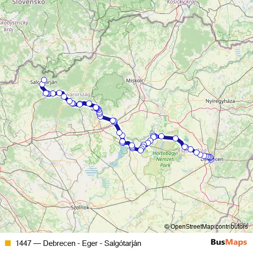 The first stop of the 1447 bus route is Debrecen, autóbusz-állomás and the last stop is Salgótarján, autóbusz-állomás. 1447 (Debrecen - Eger - Salgótarján) is operational during everyday.