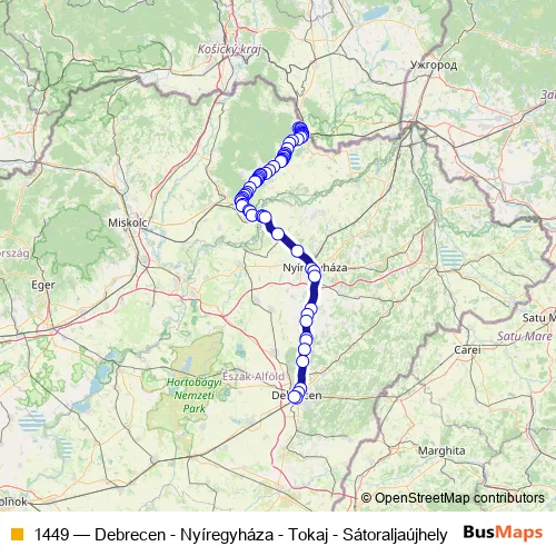 The first stop of the 1449 bus route is Sátoraljaújhely, Kalandpark and the last stop is Debrecen, autóbusz-állomás. 1449 (Debrecen - Nyíregyháza - Tokaj - Sátoraljaújhely) is operational during everyday.