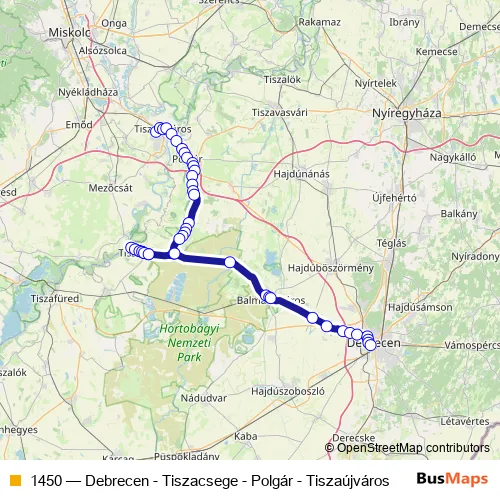 The first stop of the 1450 bus route is Tiszaújváros, MOL autóbusz-váróterem and the last stop is Debrecen, autóbusz-állomás. 1450 (Debrecen - Tiszacsege - Polgár - Tiszaújváros) is operational during on weekdays.