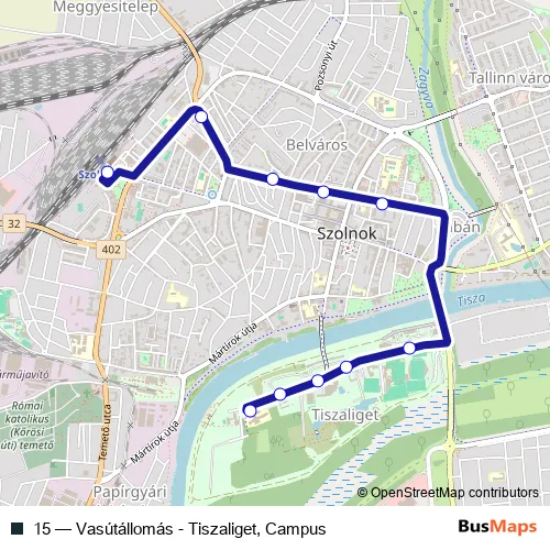 The first stop of the 15 bus route is Szolnok, vasútállomás and the last stop is Szolnok, Tiszaliget, Campus. 15 (Vasútállomás - Tiszaliget, Campus) is operational during everyday.