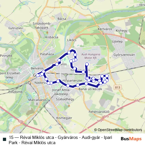 Click here to view the nearest 15 - Révai Miklós utca - Gyárváros - Audi-gyár - Ipari Park - Révai Miklós utca bus stop.